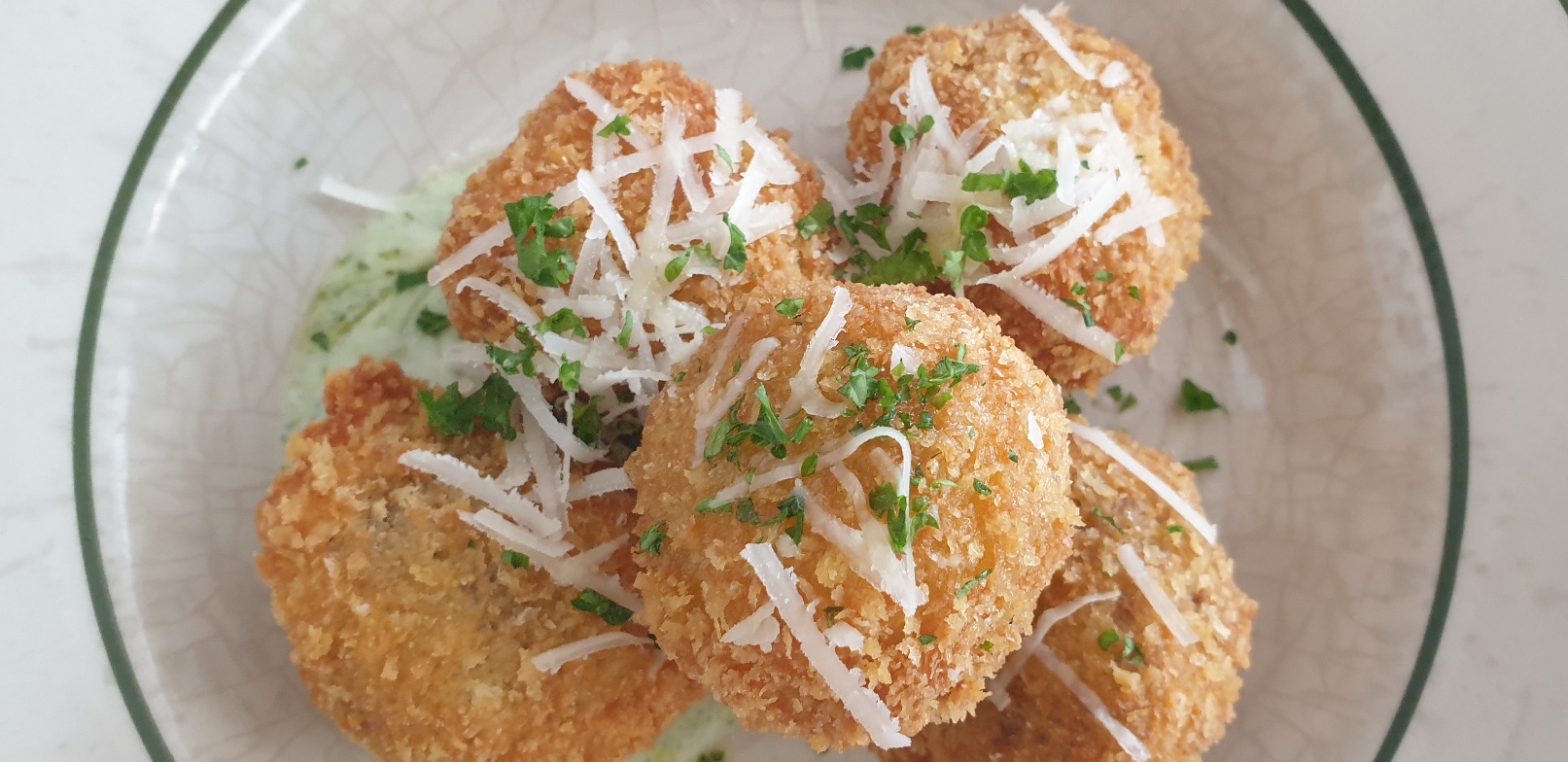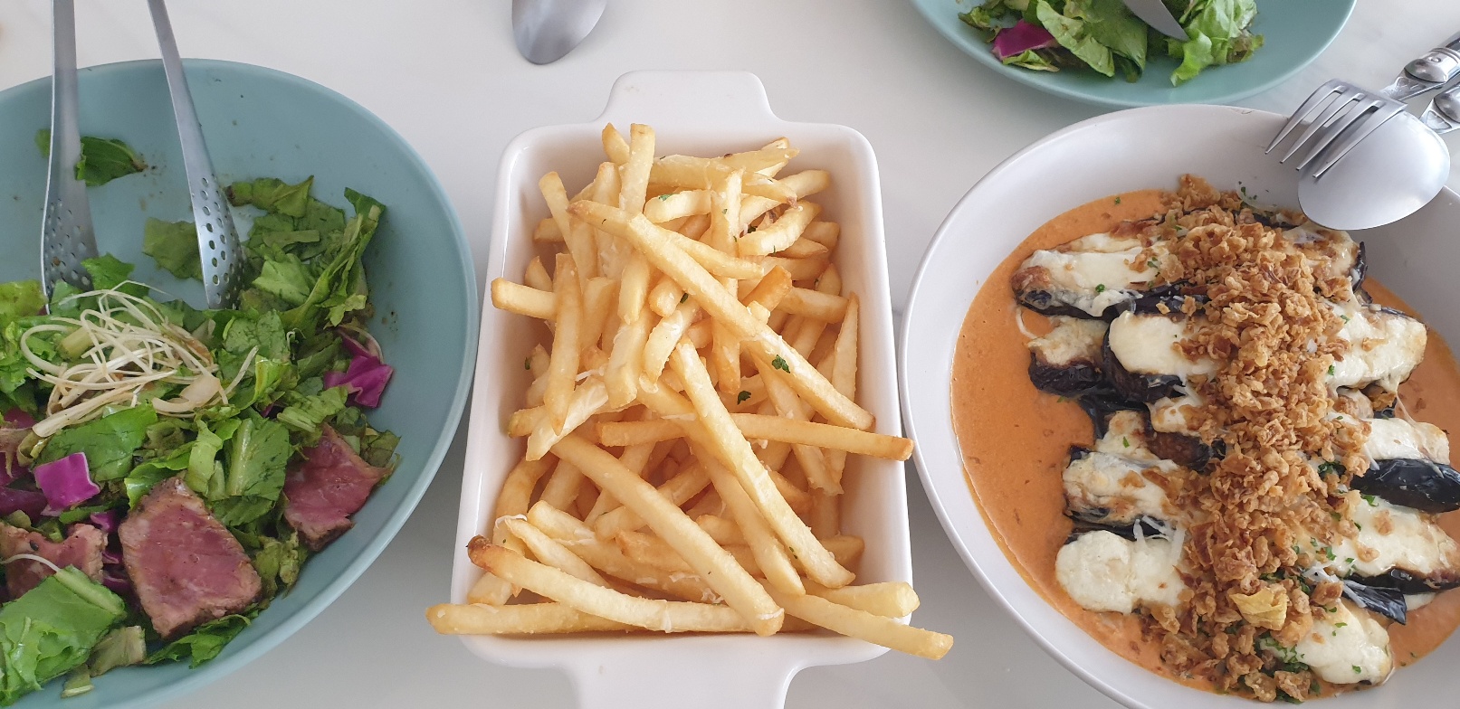 구운 가지에 모짜렐라 치즈, 바삭 프레이크, 간을 책임지는 소스..